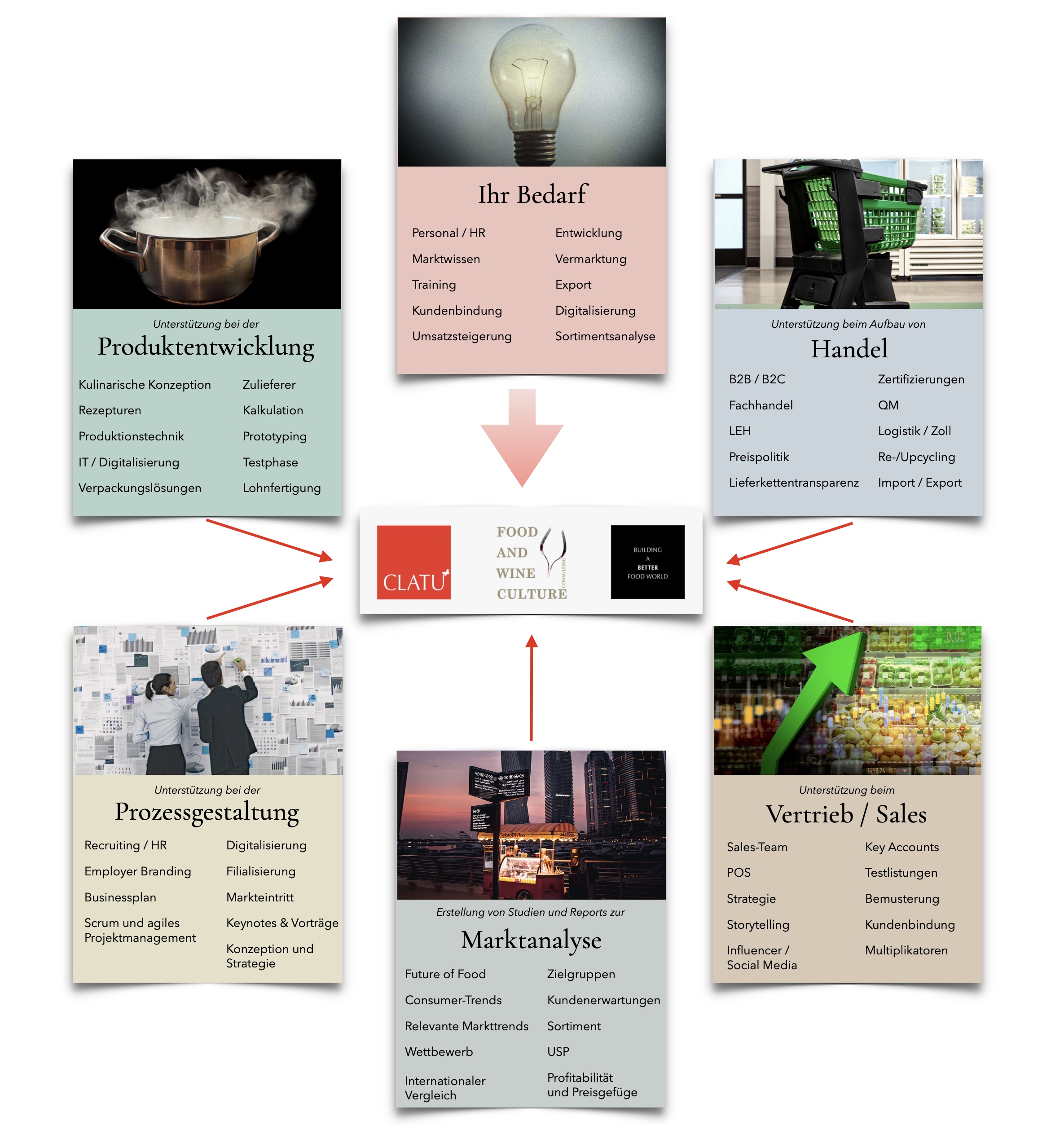 FOOD AND WINE CULTURE ist Teil der → CLATU Gruppe (clatu.com), einer europäischen Allianz aus Beratung Lebensmittel Unternehmensberatung, Köchen, Redakteuren, Sales-Profis, Designern, IT-/Digitalisierungs-Spezialisten, Trainern und Coaches, die sich in einem Netzwerk zusammengeschlossen haben. Zu unserer Gruppe gehören die → CLATU Akademie (Vorträge, Seminare, Workshops, Coaching), → CLATU Startup (Beratung und Coaching für Unternehmensgründer), → CLATU Solutions (Marketstudien, Sales-Team und ergänzende Services) und die FB-EXPERTS.