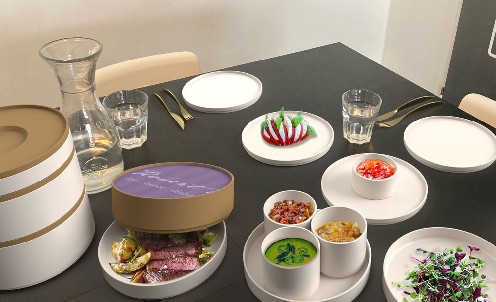 Professionelle Verpackungslösungen vermitteln dem Gast die ganze Liebe und Sorgfalt, die bei der Zubereitung investiert wurde, und schaffen ein hochwertiges Kundenerlebnis zu Hause. Die Speisen können dabei ohne irgendwelchen Verpackungsmüll sicher transportiert und geliefert werden. Diverse Behältnisse vom flachen Teller mit Cloche bis zur tiefen Schale mit Deckel oder kleineren Behältern für Saucen, Suppen oder Desserts lassen sich einfach und dicht aufeinander stapeln und in speziellen Thermoboxen sehr platzsparend befördern.