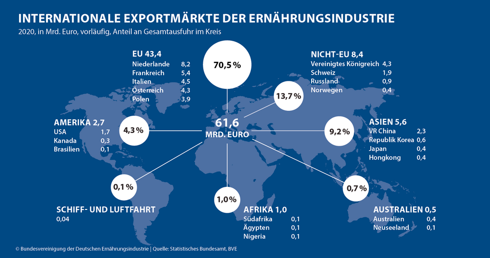 Die Länder der DACH-Region sind führende Exportnationen für Lebensmittel. Das Exportgeschäft trägt wesentlich zum Branchenumsatz bei und ist der Wachstumsmotor für viele Produzenten. Jeder dritte Euro wird heute im Ausland verdient. Das exzellente Preis-Leistungs-Verhältnis, die hohe Qualität der Produkte und die Zuverlässigkeit Europäischer Hersteller werden weltweit geschätzt. Die wichtigsten Märkte – neben der Schweiz – sind Großbritannien, China, Südkorea, Japan und die USA.