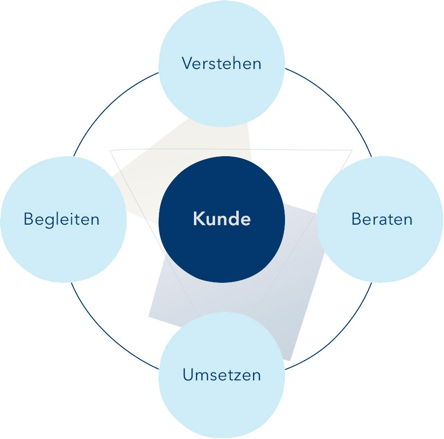 Mit unserem umfassenden Beratungsprozess verfügen wir über eine solide Basis für die Erreichung Ihrer Ziele. Verstehen – Beraten – Umsetzen – Begleiten: Das sind die vier Schritte, die wir gemeinsam mit Ihnen gehen.